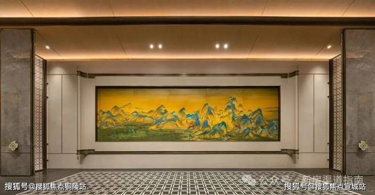 穿过门厅,九米巨幅《千里江山图》非遗漆画豁然眼前,天然大漆经千道工序打造,还原青绿山河壮阔,诠释归家即入传世名画的礼序