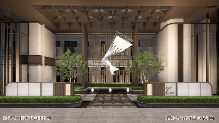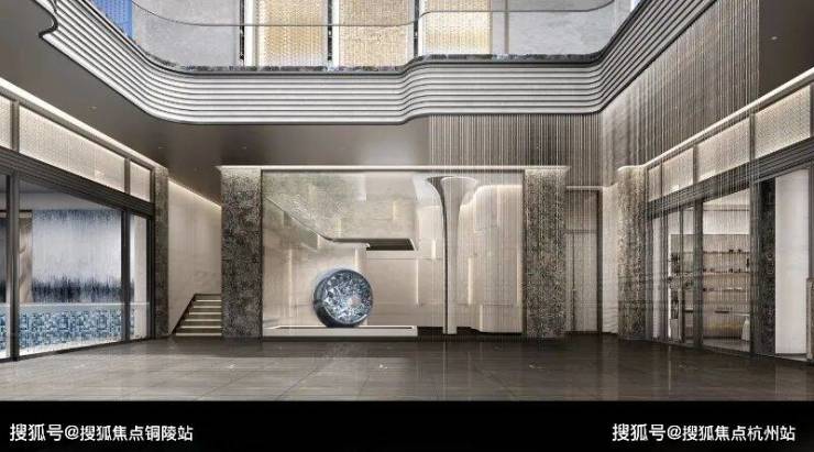 挑高金属雨棚采用极细边,中间凿壁采用透光奢石,搭配极具现代主义的雕塑彰显小区档次,背景墙面采用维多利亚黑大理石,奢华且低调。