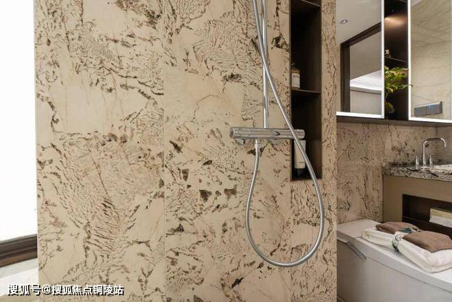 细节方面,卧室采用复杂木地板拼花,其他空间也大多覆盖了岩板或奢石!哪怕是卫生间的墙面、直连餐客厅的阳台,全部做到了岩板通铺,视觉上保持了统一性!