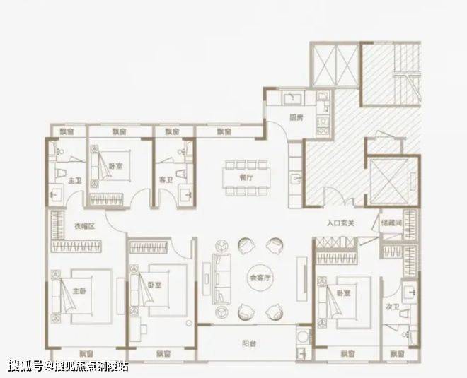 要知道,现在市面上的主流做法,是把三房的各个功能空间,都做飘窗设计,以得到更开阔的景观视野,并增加实际面积使用率。