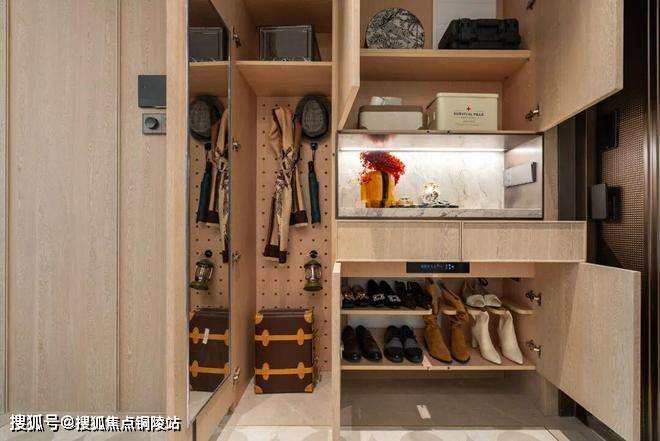 比如说玄关收纳,通过对空间的细分,预留了次净衣区、行李箱收纳、扫地机器人收纳等,增添洞洞板用以悬挂雨伞等;在鞋柜方面,底层镂空,可摆放家居拖鞋,通过隔层高低的不同划分,预留靴子收纳空间。