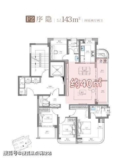 建面约143㎡还有一个侧厅户型,如果将客餐厅和双阳台打通之后,业主将获得一个约40㎡的起居空间!