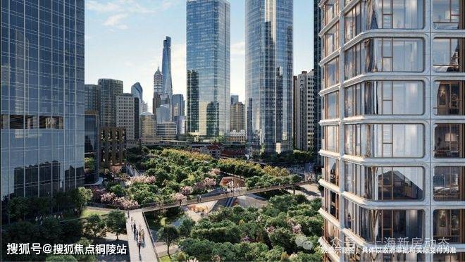 项目占据北外滩核心区一块规整且相对充裕的地块,这使绿城有空间跳出“向下拓展”的常规思路,转而将景观资源向空中延伸,打造“地面+空中+局部下沉”的三重立体游园体系。