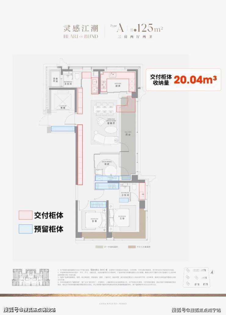 据小胖君手工统计,项目125㎡3房边套户型的整体交付柜子+预留衣柜,收纳空间可以达到约20.04m³,中间套户型也能达到约16.56m³!