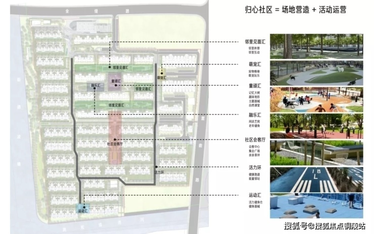 社区凭借建筑布局上的差异性创造丰富的社区公共空间,以“街园结合”的方式构造出更加多元化的活动空间。社区内针对不同年龄层业主的需求,打造了6大归心社区落位,包括邻里见面汇、萌宠汇、童顽汇、融乐汇、社区会客厅、活力环、运动汇。