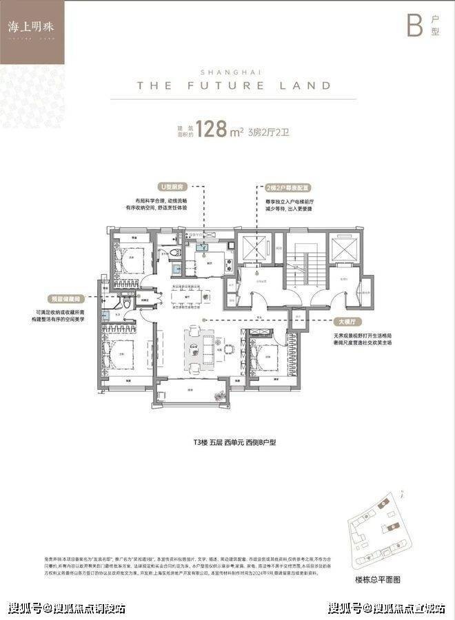 户型特色:整体布局较为合理,动静分区;U 型厨房布局科学,动线流畅且有收纳空间;设有独立入户电梯前厅,减少等待;预留储藏间可满足收纳需求;大横厅设计开阔,营造社交主场。
