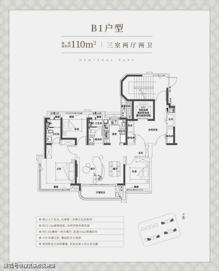 建面约110㎡中间套竖厅户型,同样也是标准的南北通透飞机户型,整体室内的采光、尺度感、通风都相当出色。非常适合一家三口、年轻夫妻的全生命周期需求!