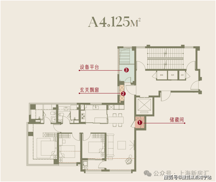 南向面宽达13.4m,四开间朝南,全卧超南。实得率超95%,多了20平空间,三阳台,满飘窗,设备平台,主卧室270°套间设计。层高3.15米。这个户型对比样板房,储藏间更大了,玄关收纳空间更大,收纳空间更多