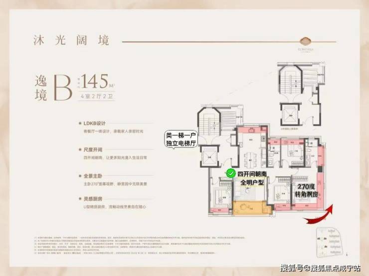 这个户型全部是类一梯一户独立电梯厅设计。四开间朝南+南北通透+全明户型+270度大飘窗,改善户型的终极之作!无论是四口之家还是三代同堂,尺度都能完全容纳。