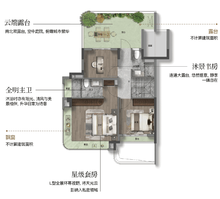 如果说112㎡户型是平面空间的极致利用,那么约144㎡的上叠户型则开启了垂直生活的无限遐想。其建筑面积约144㎡,但通过巧妙的挑空、露台及灵动空间设计,实际可使用面积高达约180㎡,实得率约125%,价值感瞬间拉满。