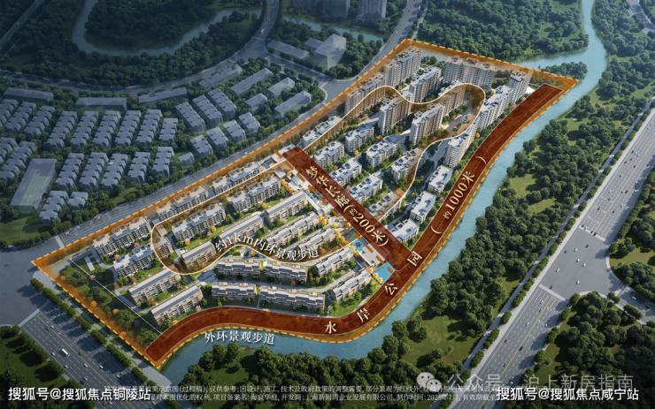 横轴—约1.5公里水岸公园,借景河道横穿自然三景