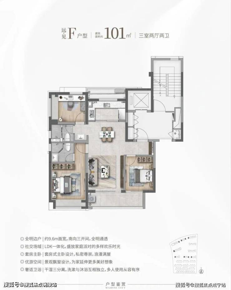 建面约101㎡户型,做到了3房一步到位,购房者也无需更多纠结,同时还可获得更统一的圈层;