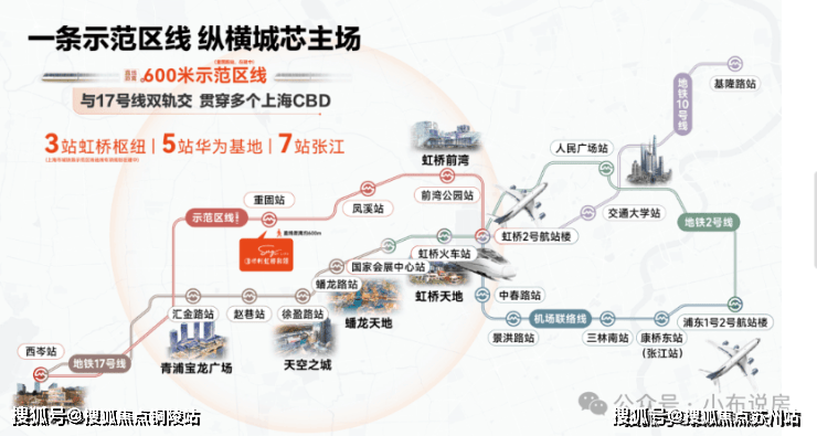 示范区沿线汇聚大量高能商业。2到到前湾芳乐路TOD,有开市客及前湾印象城(在建),3站到虹桥枢纽,则有虹桥天地及龙湖天街等。另外徐盈路天空之城、徐泾蟠龙天地、百老汇等也能快速抵达。