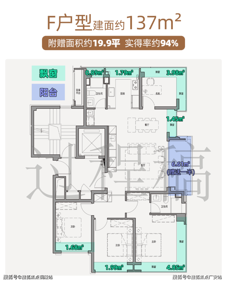 全屋7飘窗+半封阳台,赠送面积近20㎡,实得率约94%。