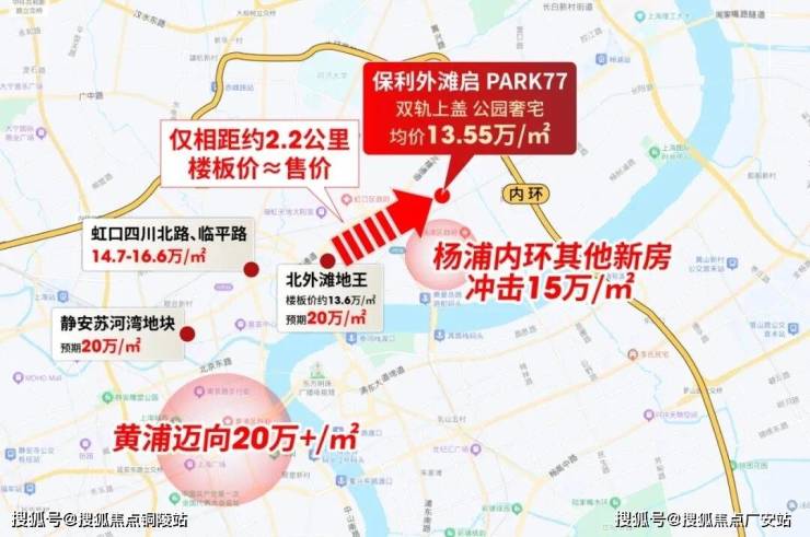虹口四川北路-临平路14.78-16.6万/㎡,北外滩绿城地王楼板价达约13.6万/㎡,这一楼板价,几乎与保利外滩启PARK77均价(13.55万/㎡)持平,未来该地块也将剑指20万/㎡。