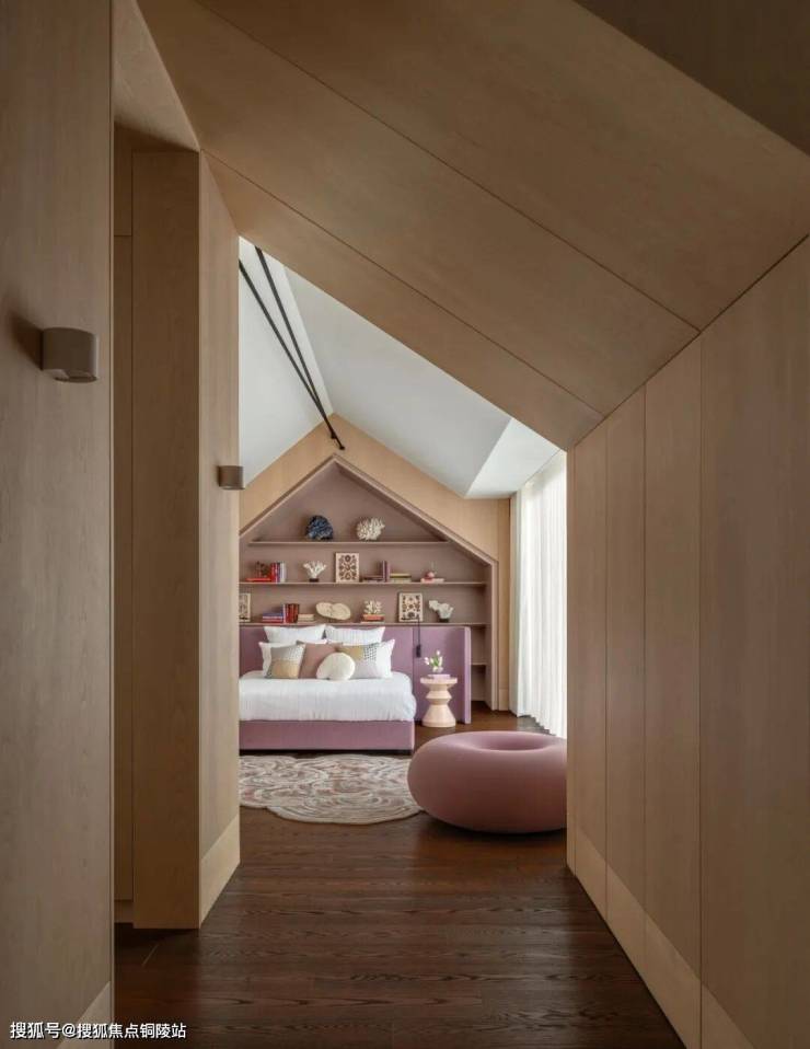 四层阁楼是大女儿的卧室。这里的斜顶启发我们在空间内打造了一个木质小屋;配备私人浴室和衣帽间,还有一个露天阳台,仿佛这充满阳光的一层就是个独立公寓。