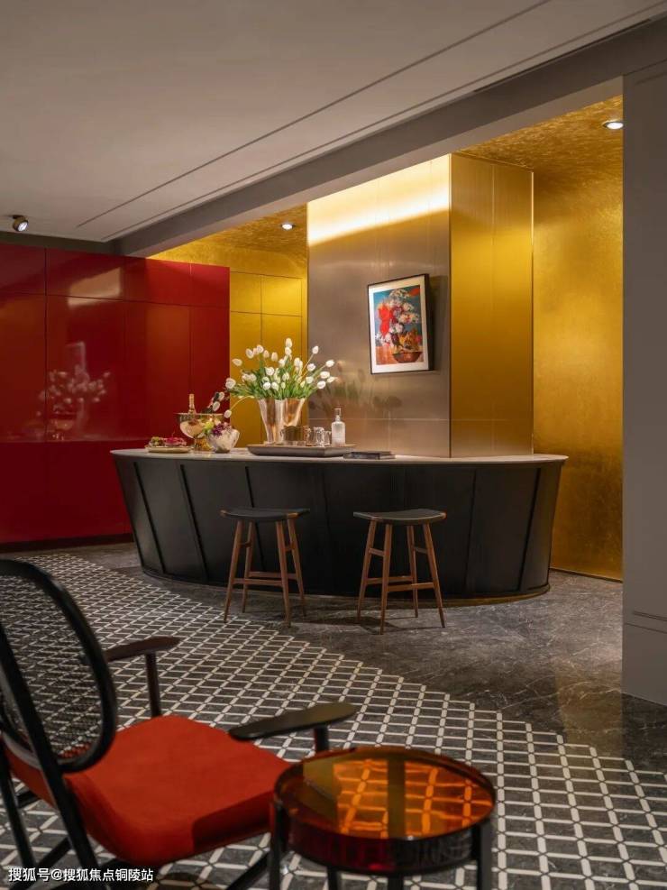 在“木屋”后方,是一个墙面和天花板都覆盖金箔的“水吧”。在这里,我们重新引入了一些当代西方设计语言——大理石地面图案、蛋形吧台和墙面护板细节。这些元素与醒目的红色高光烤漆柜相互平衡。