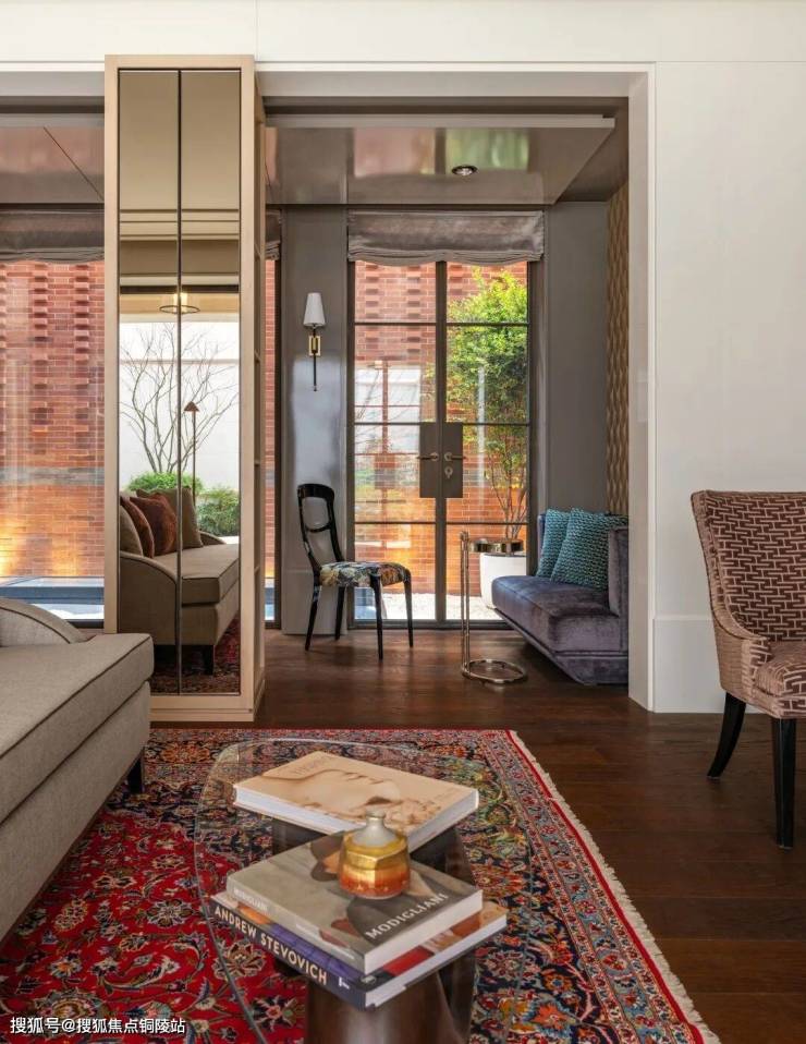 在对角,我们开辟了一面落地窗展示酒窖,展现主人的收藏。温暖的酒窖灯光和壁炉光线映照在白橡木酒架上,为客厅带来温暖舒适的氛围。