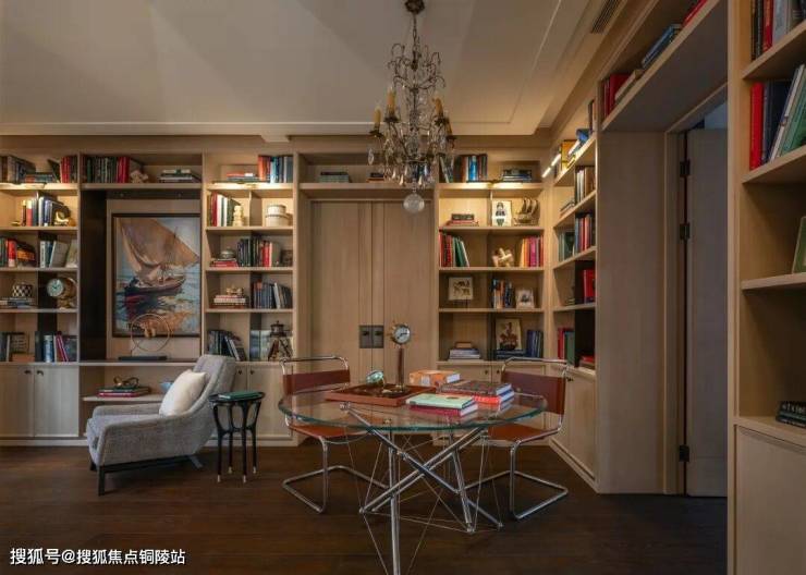 在客厅中,两个展示架巧妙地将空间分隔成主客厅区和休闲室,营造出一个与建筑尺度交相辉映的层次空间。