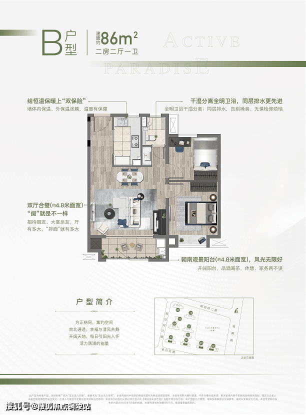 建面约86平两房两厅一卫,做到了双开间朝南+卫生间干湿分离+约4.8米大面宽客餐厅,是舒适型2房户型。