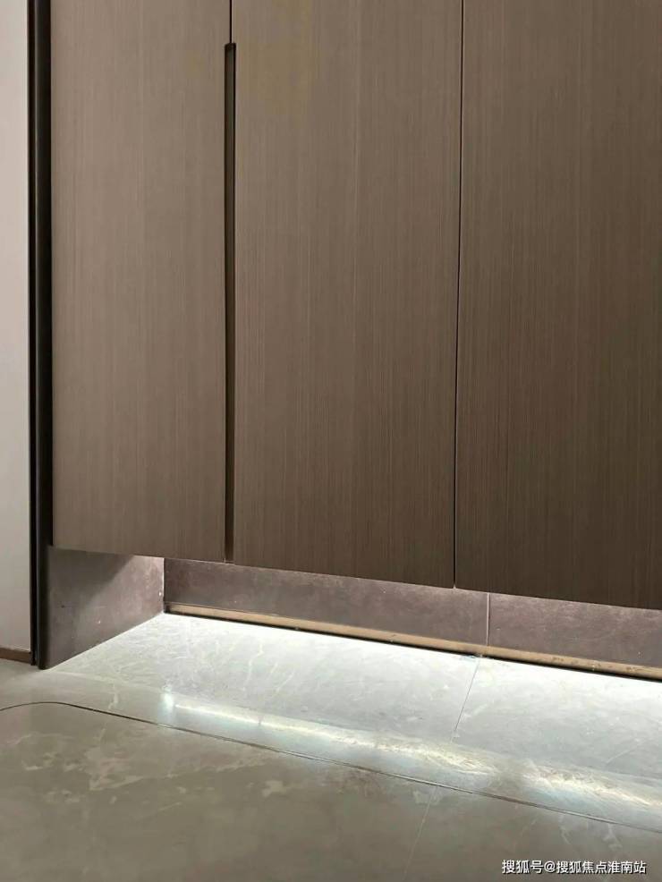鞋柜下方做了 悬浮处理 ,同样也是 内嵌灯带 ,这里灯光的角度还会再调整,因为灯光映射在大理石地面上,要显得尽量柔和不刺眼;同时,鞋柜下方可放拖鞋,还能放扫地机器人,便于日常清扫打理。