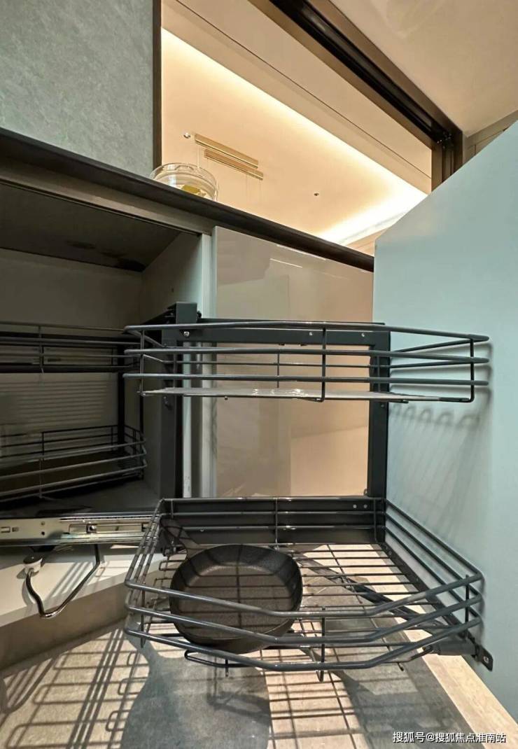 下方的橱柜则做了 转角拉篮, 充分利用转角空间,使物品井然有序的同时,轻松方便取放。