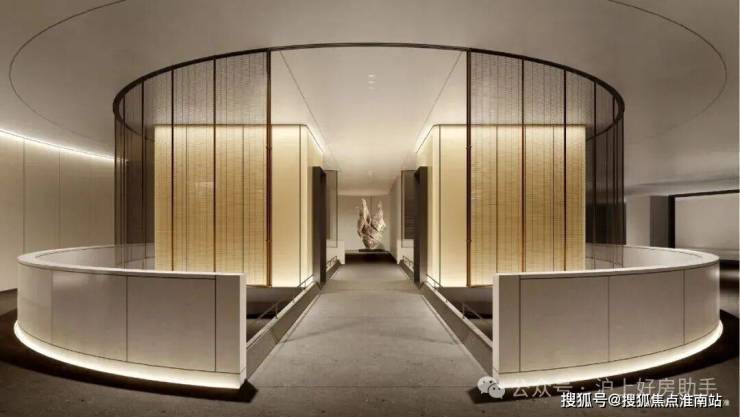 比起中规中矩的直线,弧形施工工艺更复杂、造价更高,却多了几分灵动轻盈!这种弧形的元素不只是在样板间里,在售楼处也能经常看到,比如电梯厅。