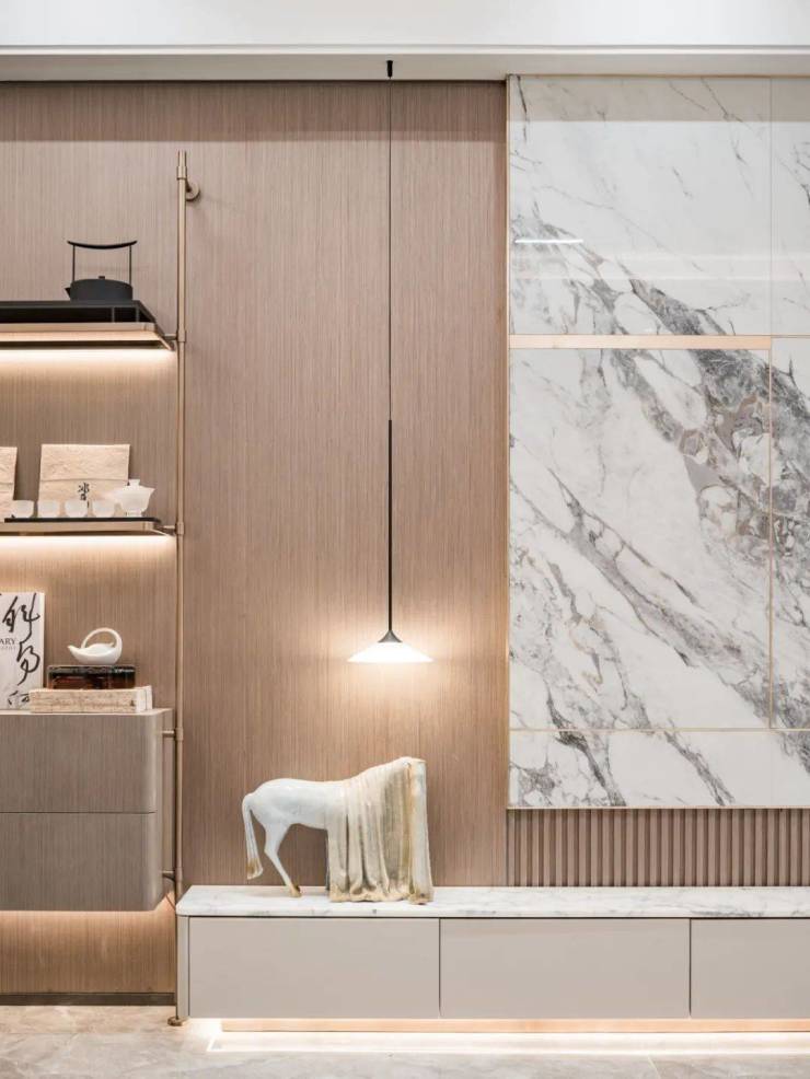 玄关收纳系统:便于鞋袜穿戴的隐藏式折叠凳、玄关柜层板自由可变式设计;