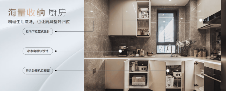 橱柜收纳系统:特别预置洗碗机点位、柜内下拉篮式设计、不锈钢挡油板、柜下操作灯、烹饪全流程功能动线一体化设计;