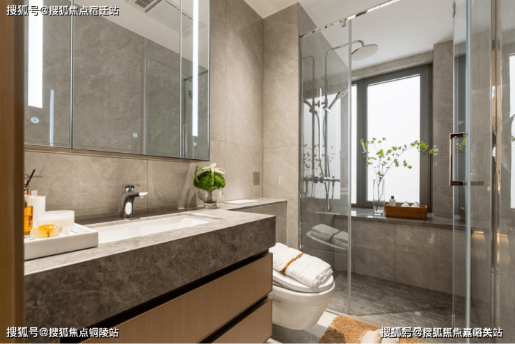 细节相当多,再提一点,卫生间台面都选用天然石材,触感光滑、厚重。