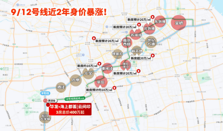 一条在建的12号线西延伸段,串联起老静安、苏河湾、北外滩多个重要商务区,拥有多达13个换乘站的“地铁换乘之王”。25年12号线沿线的房价暴涨,项目作为12号线延伸段的关键枢纽,价值也随之高涨。
