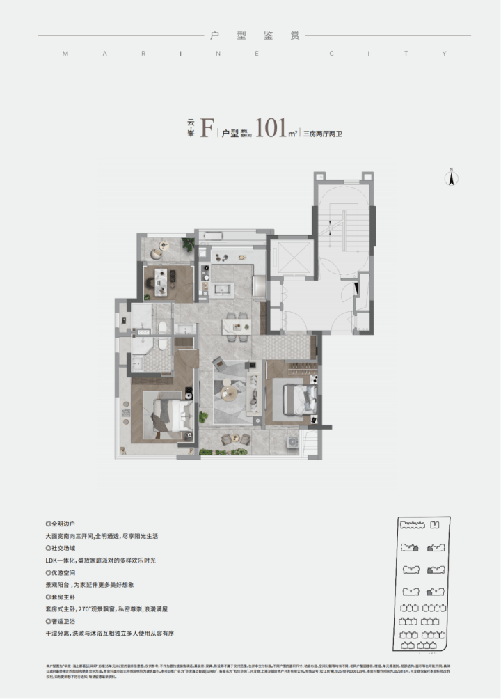 边套F户型:飞机户型+三开间朝南+客餐厅厨一体化+大尺度观景阳台。