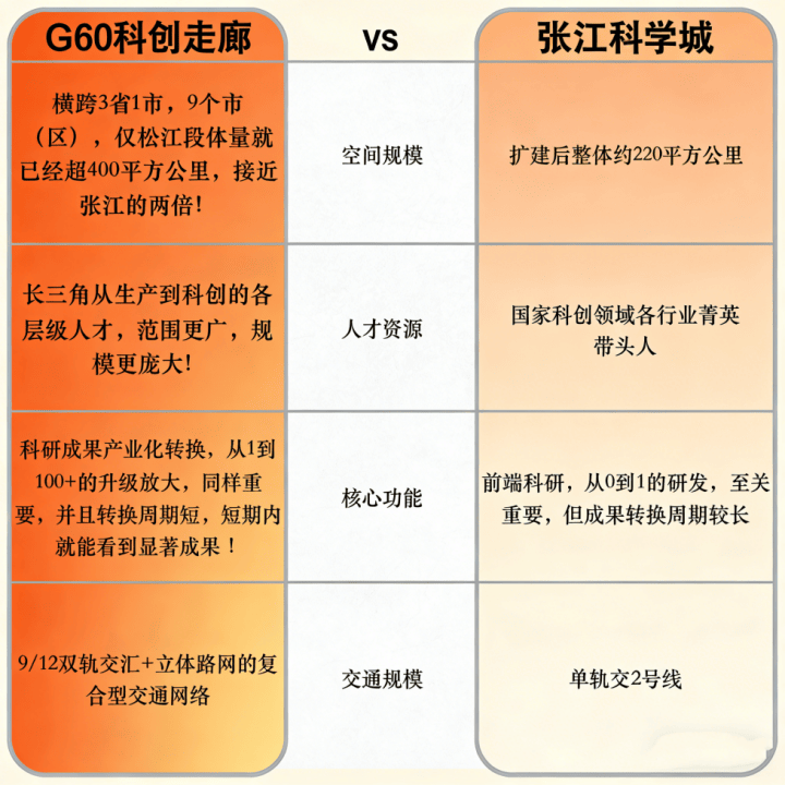 单论产业,G60科创走廊的高度是国家级战略,它的未来发展有着不输于张江的底气,来看直观对比: