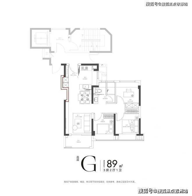 再来看下89㎡户型,3房2厅1卫,大体布局和装标与109㎡比较类似,区别在于这个小户型有S墙,卫生间做到了真正的“三分离”!