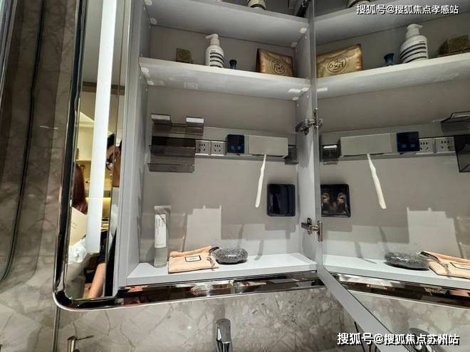 卫生间镜柜有个小小的亮点就是采用了镀铬镜柜边框,主卧镜柜有美妆冰箱,柜体也是通长的,收纳比较足。
