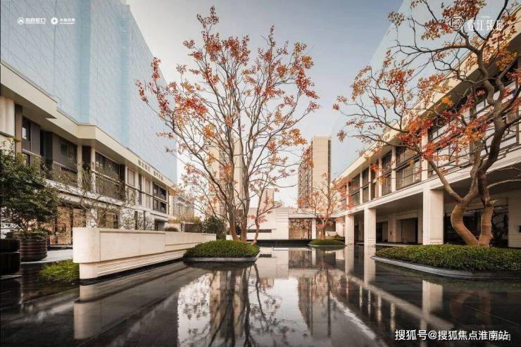 穿过门仪,核心景观是超千方镜面主题水院。安哥拉黑石材打底,水深控制在5-10公分,倒映天光云影。水面上透光云石板仿铜纹灯具,如星光落入水面。水景中嵌入三株原生丛生乌桕作为点缀,视觉精致而丰盈,是团队从千余棵苗木中挑出来的,四季色彩不同。