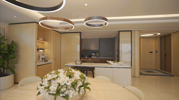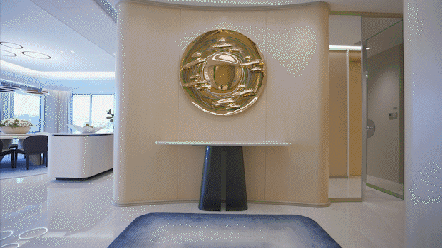 首先,三梯两户布局,私享独立电梯门厅;双入户洄游动线,预留保姆通道,顶豪该有的尊崇感被诠释得淋漓尽致。
