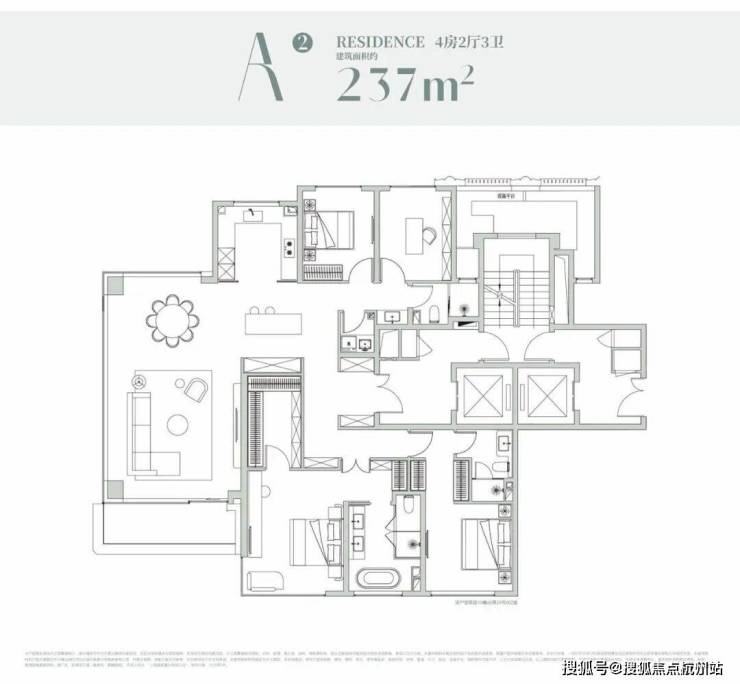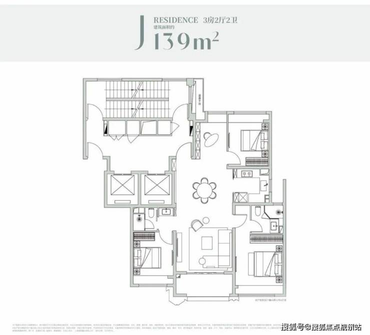 经典的四叶草布局,四开间分布在四角,兼顾私密与互动,是二胎家庭的优选。