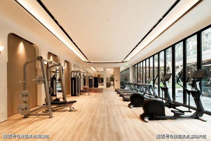 从室内恒温泳池出来,是仍然朝向下沉式庭院的瑜伽室,再往前走是健身房,它配备了小飞鸟训练器、卧式健身车、跑步机、椭圆机、哑铃训练椅等等各种健身器材。