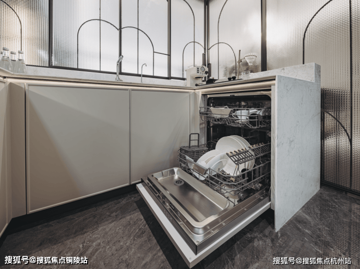 比如厨房的一圈橱柜都是飘窗,水槽也是。这样还能多出一个岛台空间,做饭的时候能和家人交流,象屿天宸雅颂,打造更有交流感的餐厨区域。