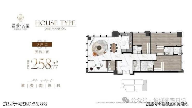 在售户型面积:主力户型为建面约 225㎡四房两厅三卫、280㎡五房两厅四卫、340㎡六房两厅五卫的奢阔大平层。