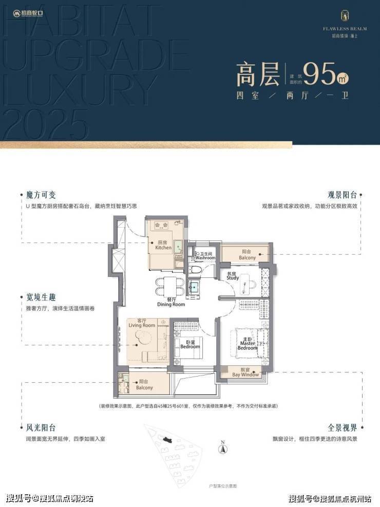 再加上南向大面宽短进深、全卧飘窗、L型转角阳台设计,哪怕小户型95㎡3房,尺度感都超棒,采光和视野更是一流。