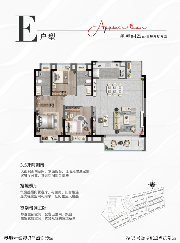 以5+1超级大盘逻辑,将住宅、商业、生活配套有机链接,并将大海的DNA赋予立面、景观等各个维度,打造自成一体的滨海城邦。