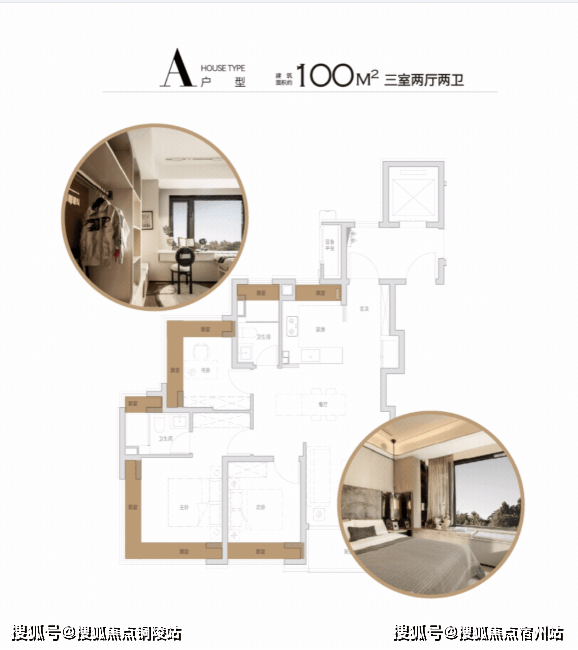 100㎡户型,双270°飘窗设计(南向主卧+北向书房),南次卧、厨房、双卫飘窗,厨房烟道外移,飘窗配置抽屉,极致空间利用率。