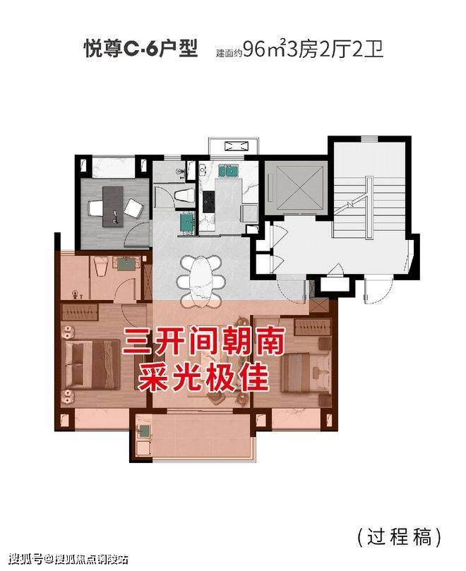 C6户型建面约96㎡3房2厅2卫: