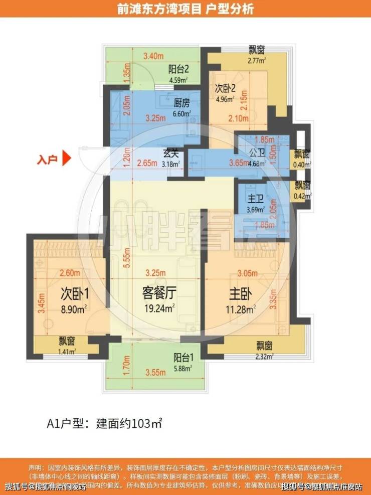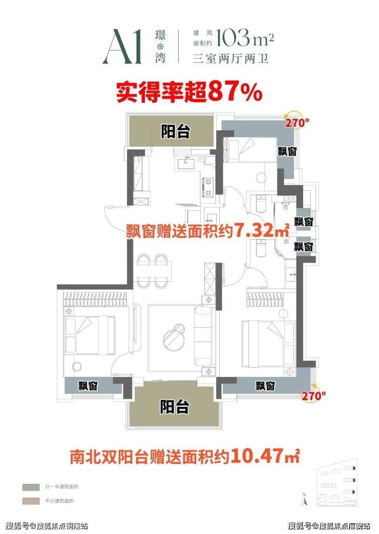 建面约103㎡A1户型,约10.47㎡南北双阳台空间,阳台“买1赠1”,赠送约5㎡,南侧观景阳台,北侧功能阳台,更附赠约7.32㎡飘窗,实得率超87%。