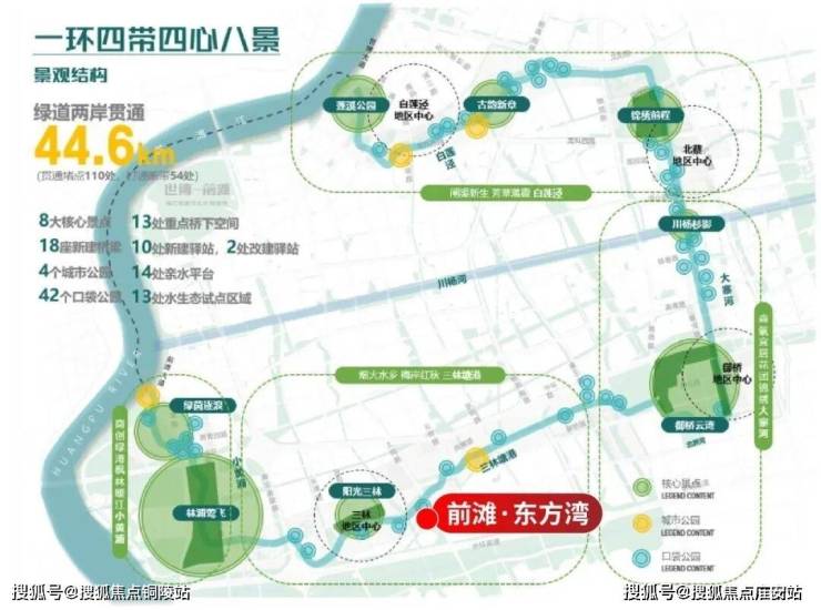 周边前滩友城公园、前滩体育公园、东明公园等已建成公园,三林塘港、“林浦莺飞”、“绿茵逐浪”等核心景点将连缀成片,形成气势磅礴的滨水公园带。