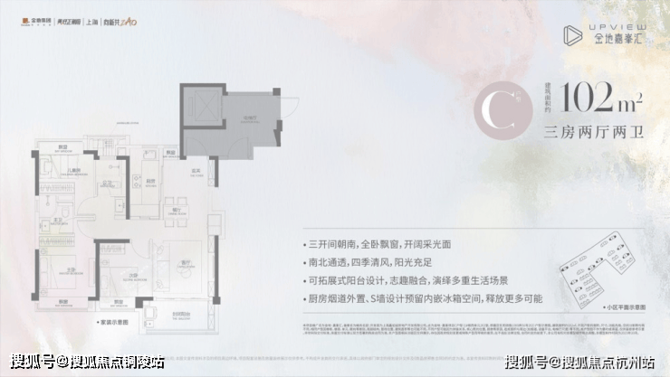 以及我们的网红爆款,建面约102㎡(C户型)三房两厅两卫,不仅保留了其小户型所有的优势,更增强了空间感和舒适度!