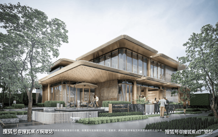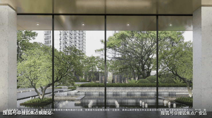 第一重——酒店式环道落客、现代精奢大堂、悬廊叠瀑水岸会客厅,移步异景,漫游归家入户;