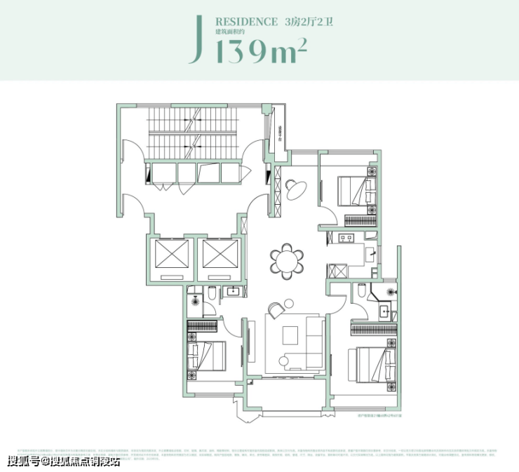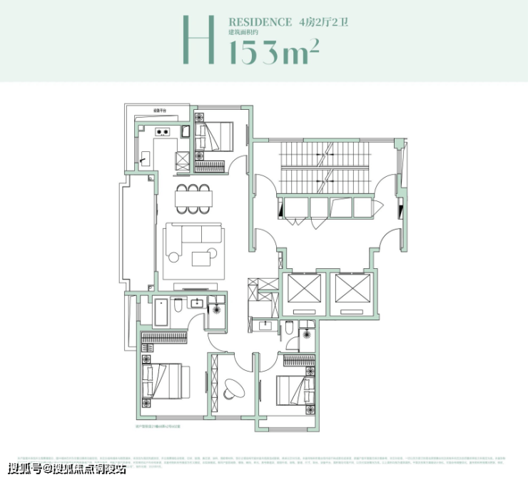 该户型是经典的四叶草布局,四开间分布在四角,兼顾私密与互动,是二胎家庭的优选;